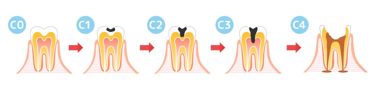 むし歯は、歯の表面から内部へ段階的に進みます。